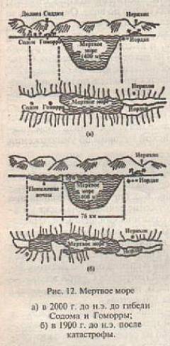 Мёртвое море имеет глубину около 500 метров, поэтому его дно более чем на 1000 метров ниже уровня Средиземного моря. Там содержится почти 30% поваренной соли ( в морях и океанах 3.3-4% ) и разнообразные химические вещества, приносимые притоками. В него впадают Иордан и множество мелких речек, но ни одна река из него не вытекает. Лишь недавно, наряду с раскопками в других частях Палестины, проснулся интерес к Содому и Гоморре. Было известно, что эти исчезнувшие города существовали в библейские времена в долине Сидим, и археологи начали их поиски. К открытиям и наблюдениям геологи добавили новые объяснения, которые могут прояснить происхождение и развязку библейской истории об уничтожении Содома и Гоморры.