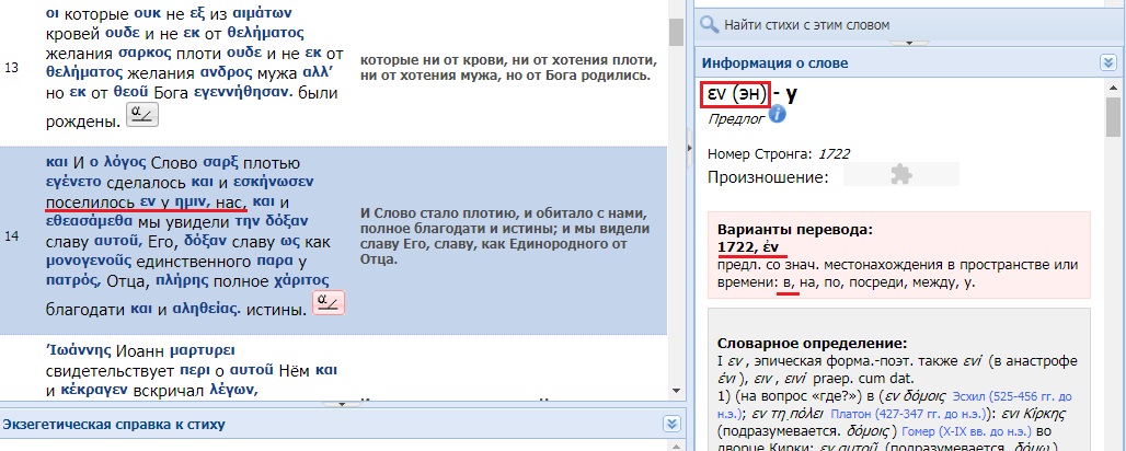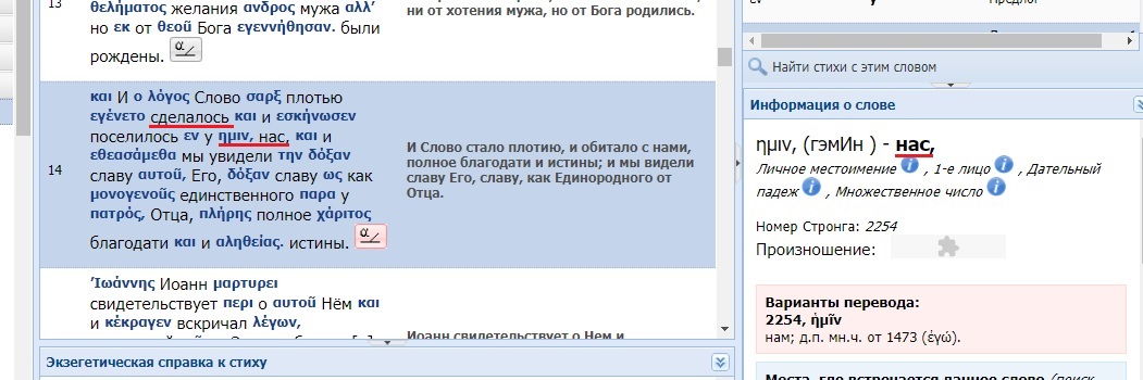 14 И 2532 Слово 3056 стало 1096 5633 плотию 4561, и 2532 обитало 4637 5656 с 1722 нами 2254, полное 4134 благодати 5485 и 2532 истины 225; и 2532 мы видели 2300 5662 славу 1391 Его 846, славу 1391, как 5613 Единородного 3439 от 3844 Отца 3962.