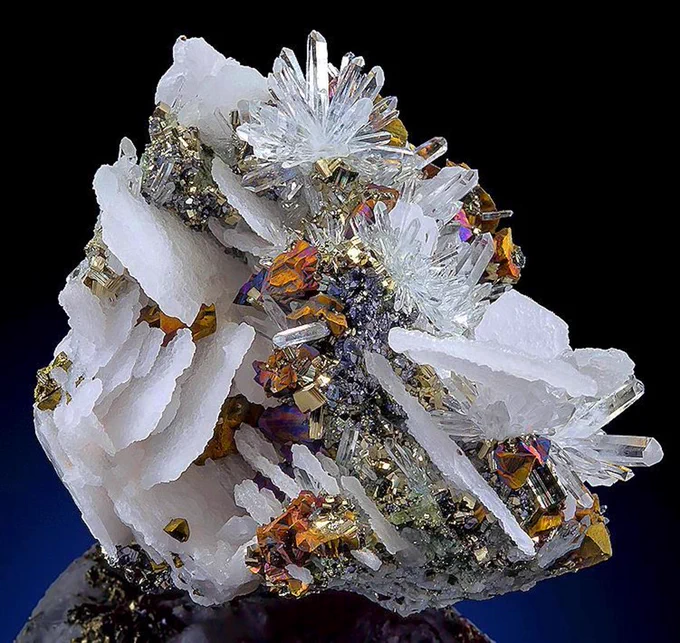 Природа здесь демонстрирует удивительное чувство цвета и композиции ~ Лезвия из кальцита с вкраплениями халькопирита, пирита и кварца, Румыния (фото: Кевин Уорд)
