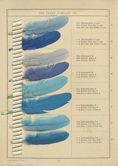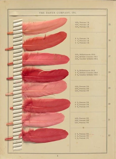 Страницы из книги образцов начала 20-го века «Оттенки перьев», в которой представлены 143 настоящих птичьих пера всех цветов, а также инструкции по использованию красителей для достижения точного цвета.