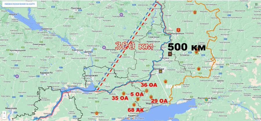 #UkraineRussianWar ⚡️Про гири. На колченогих ногах карлика. 4 армии и 1 корпус "охраняют" небольшой перешеек. Целый округ сидит в "засаде" без возможности наступать или переместится. Оркам критично нужно спрямить ЛБС на 200 км, чтобы за спиной была суша и свободные резервы.