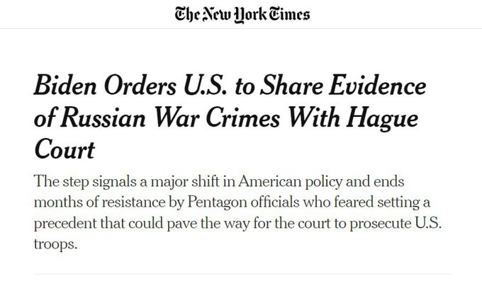 Байден приказал правительству США начать делиться доказательствами военных преступлений рф с международным уголовным судом в Гааге, NYT