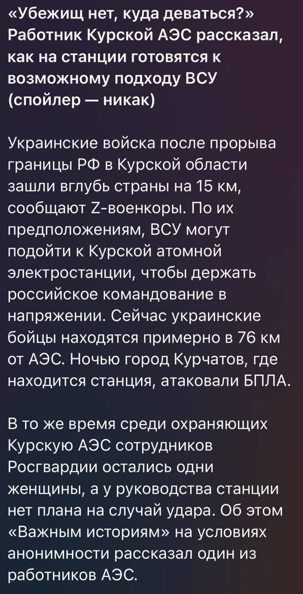 "На текущий момент на всём участке прорыва в Курской области продолжаются бои. Не исключено, что в ближайшие несколько дней противник введёт второй эшелон с целью расширить зону контроля и продвинуться далее на восток. Так что основные бои ещё впереди", "Рыбарь".