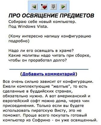 На освященномъ компьютере срамныя картины просматривать нельзя, сiе есть сугубый грbхъ. При нbпреднамbренномъ открытiи всплывающаго окна, изображающаго блудъ или всякiя нbпотребства тbлесныя, слbдуетъ читать 'Молитву отъ осквbрненiя'. Слbдуетъ помнить, что компьютеръ нbжелательно изпользовать для бbзсодержательнаго и нbспасительнаго форумнаго точенiя лясъ.
